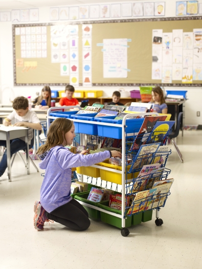 The Deluxe Book Browser & Display is for use as an in-class library where students can help themselves to a book or for maker space materials and tools. These carts are the ideal height for students and teachers to easily view and choose a book. This model includes book racks on the sides and back to hold even more! Tubs include the perfect spot for a label (labels not included) and can be used to colour code Lego? and other maker and STEM materials. This book cart can hold up to 40kgs and is built to last!