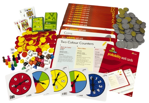 200 two-colour counters, 114 plastic coins, 5 assorted spinners, 3 packs of playing cards, 10 pawns, 22 assorted dice, 12 probability work cards.