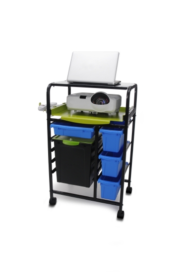 of storage. The cart's height is suitable for teachers to sit or stand