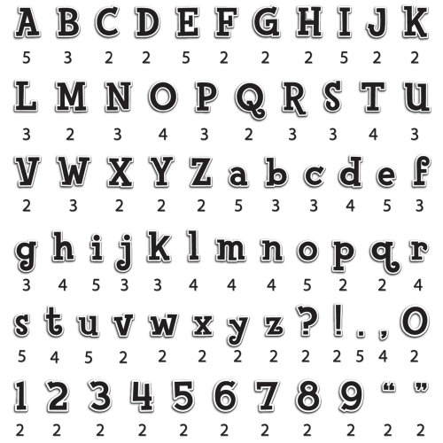 Contains 210 pieces consisting of upper- and lower-case letters, punctuation marks and numbers.
